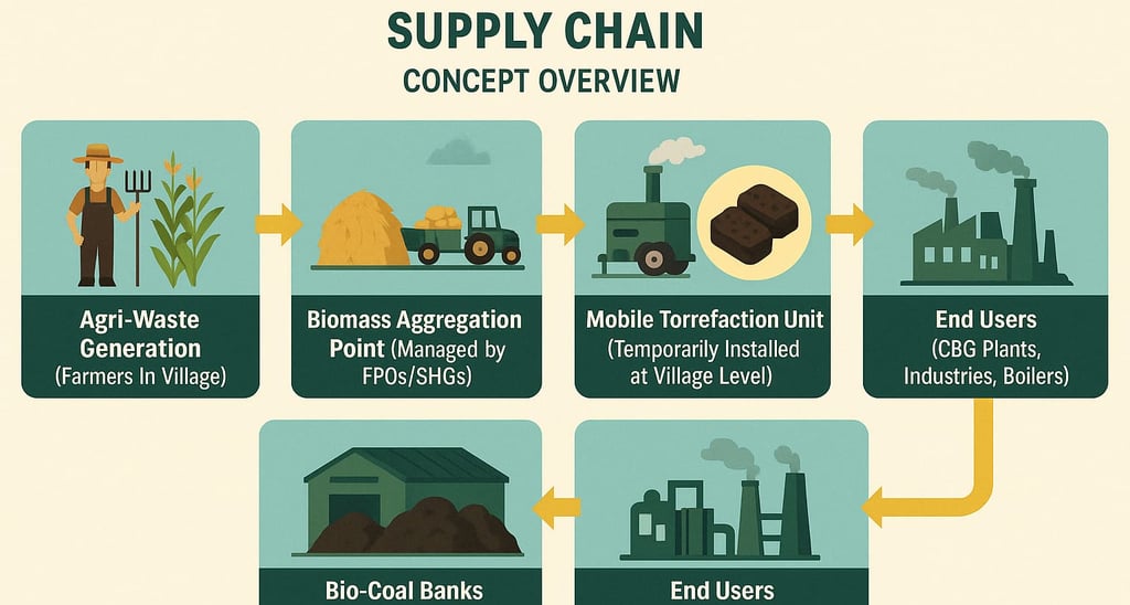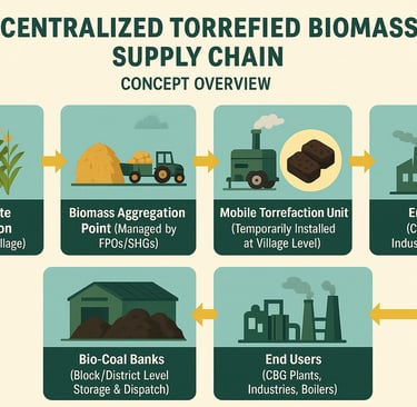 Transforming agricultural waste into high-value energy resources—solid (bio-coal/bio-coke), liquid (ethanol/methanol), and gas (CBG/green hydrogen)—while developing an efficient rural-industrial supply chain.